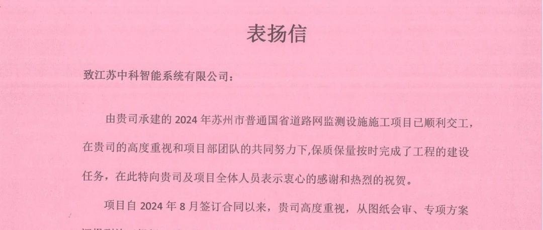 近日,蘇州市公路事業(yè)發(fā)展中心給我公司發(fā)來表揚信,對我公司在“2024年蘇州市普通國省道路網(wǎng)監(jiān)測設(shè)施施工項目2024-LWJC標(biāo)段”項目中的整體工作予以認可